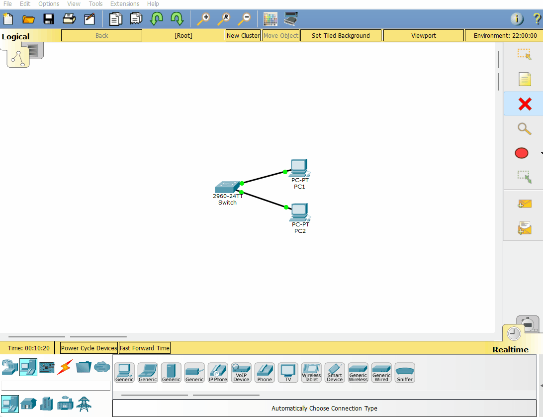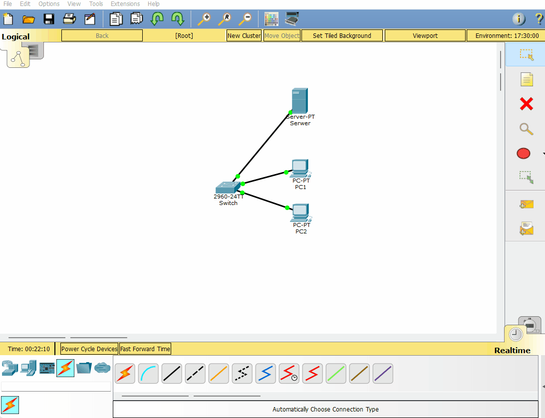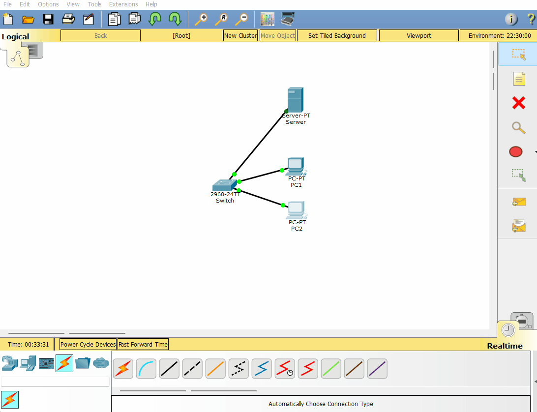 1. Dodaj 2 komputery PC oraz switch (połączyć konektorami).