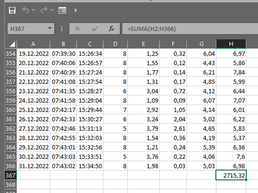 skopiuj na dół - Następnie zsumuj kolumnę zużycie dla dat z zakresu roku 2022