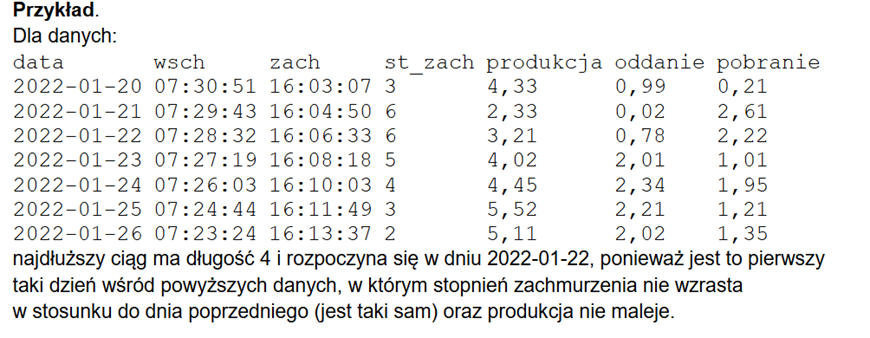 Znajdź najdłuższy ciąg kolejnych dni roku, w których stopień zachmurzenia nie wzrastał w stosunku do dnia poprzedniego i jednocześnie wartość wyprodukowanej energii nie malała w stosunku do dnia poprzedniego. Podaj długość tego ciągu oraz datę pierwszego dnia tego ciągu. Jest tylko jeden taki ciąg.