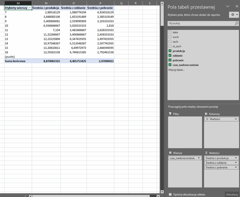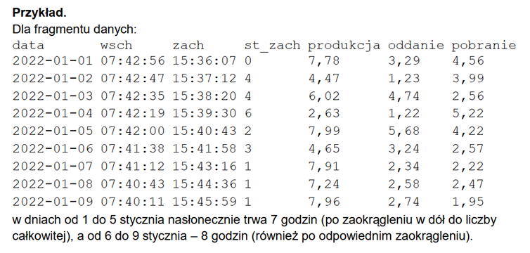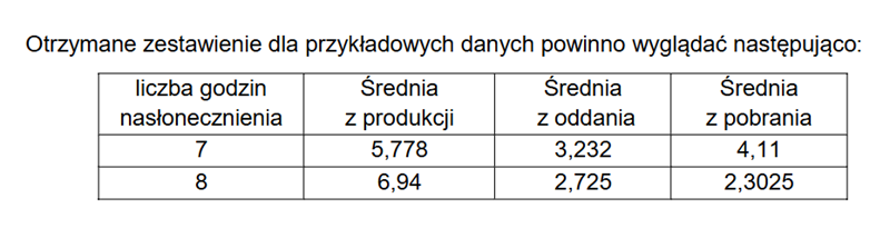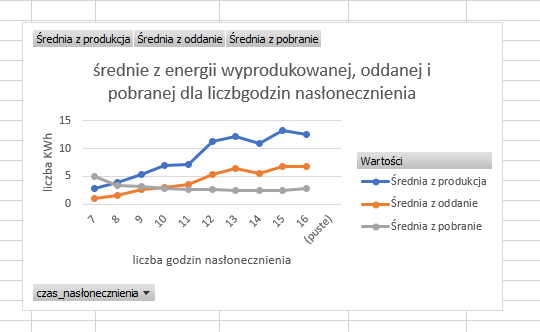 Dla każdego dnia oblicz czas nasłonecznienia w godzinach (czyli czas od wschodu do zachodu słońca). Wynik zaokrąglij w dół do liczby całkowitej. Utwórz zestawienie, w którym dla każdej liczby godzin nasłonecznienia podasz średnie ilości wyprodukowanej energii, oddanej energii i pobranej energii. Na podstawie wykonanego zestawienia utwórz wykres liniowy porównujący te wartości w całym roku. Pamiętaj o czytelnym opisie wykresu (tytuł, legenda, tytuły osi).