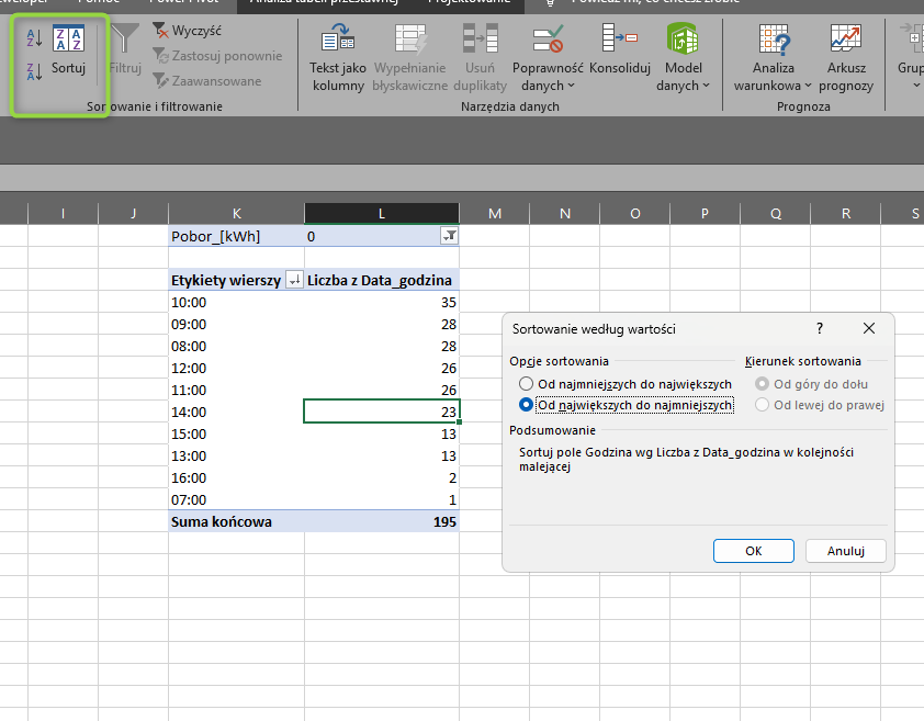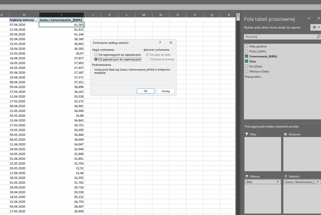 Posortuj kolumnę „Suma z Generowanie” malejąco → pierwsza pozycja to dzień z największą generacją.