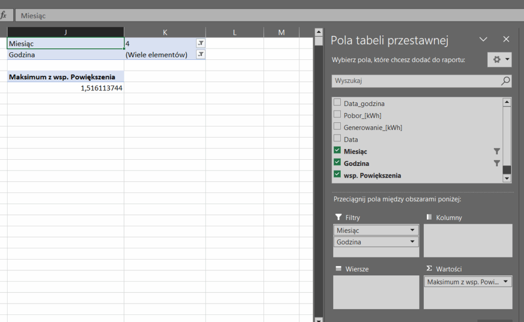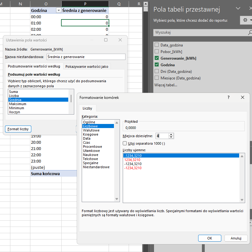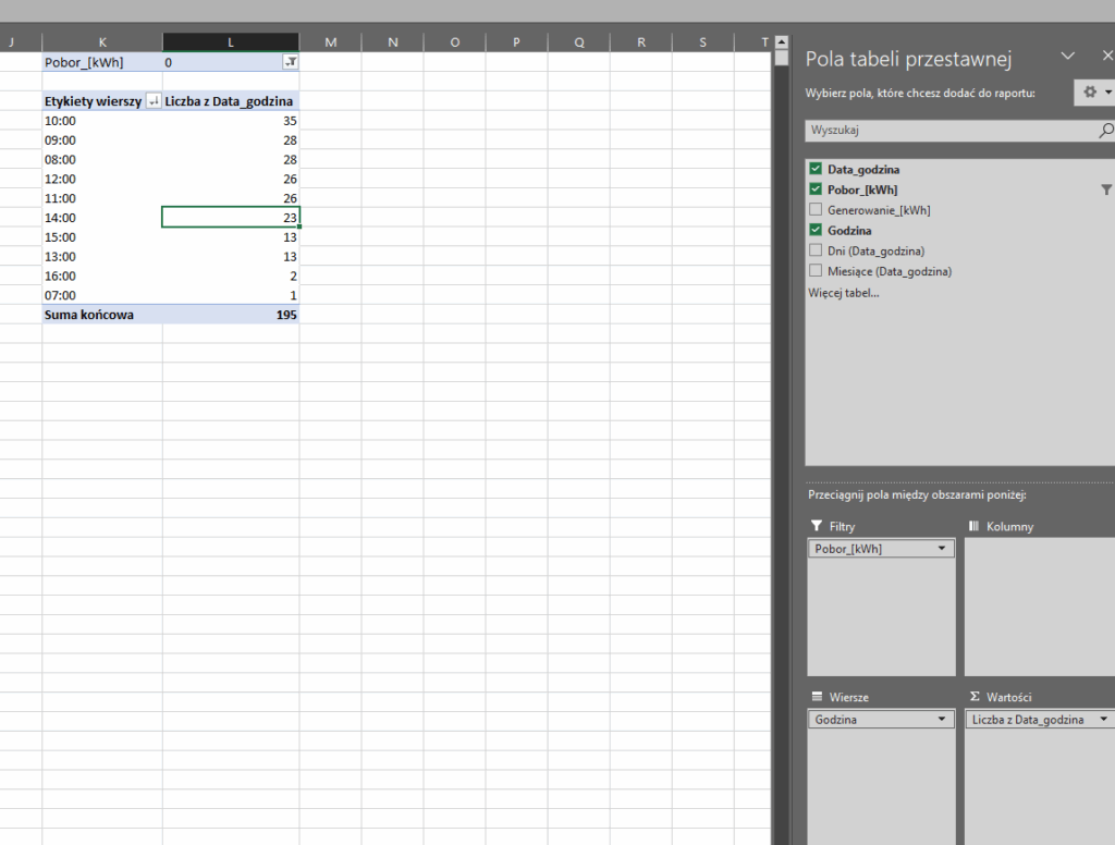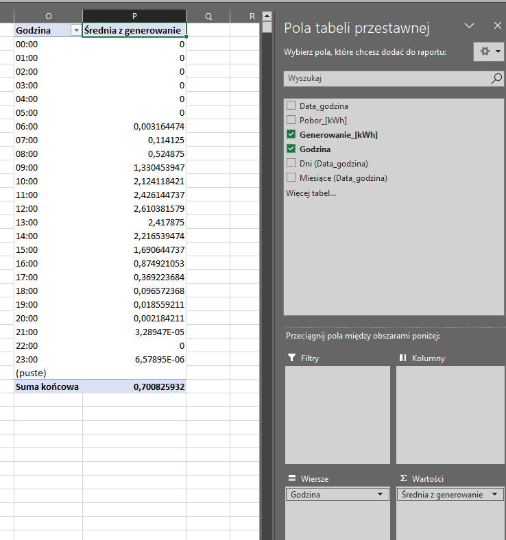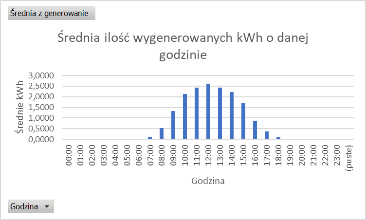 Wartości w tabeli przestawnej to teraz średnia ilość wygenerowanych kWh o danej godzinie